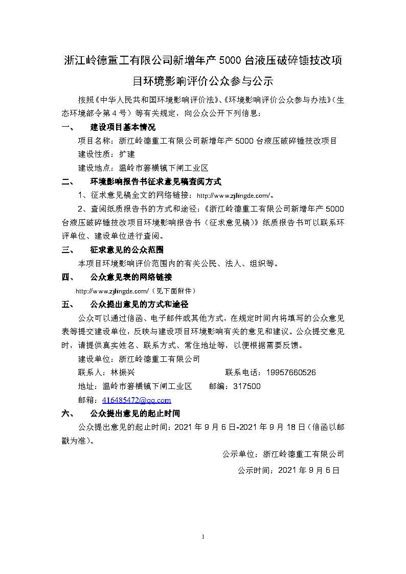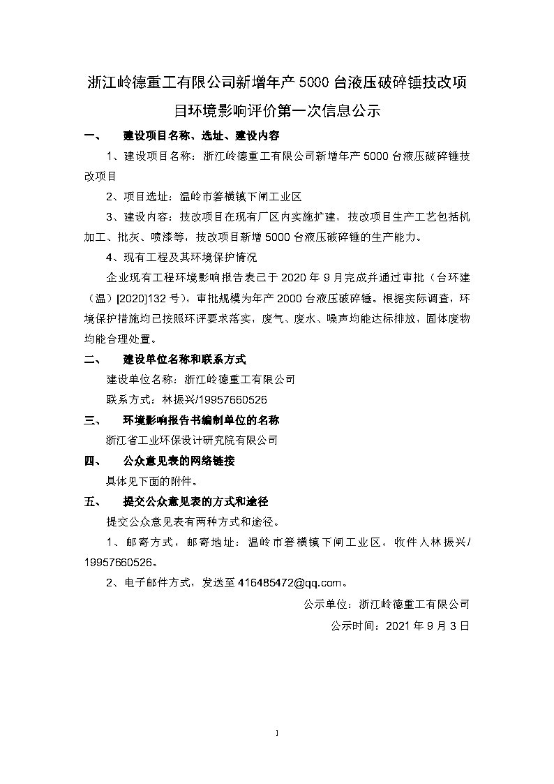 浙江嶺德重工有限公司新增年產(chǎn)5000臺液壓破碎錘技改項(xiàng)目環(huán)境影響評價第一次信息公示