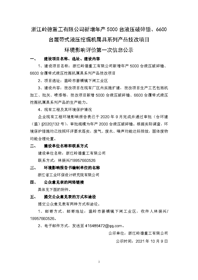 浙江嶺德重工有限公司新增年產(chǎn)5000臺液壓破碎錘、6600臺履帶式液壓挖掘機(jī)屬具系列產(chǎn)品技改項(xiàng)目環(huán)境影響評價第一次信息公示