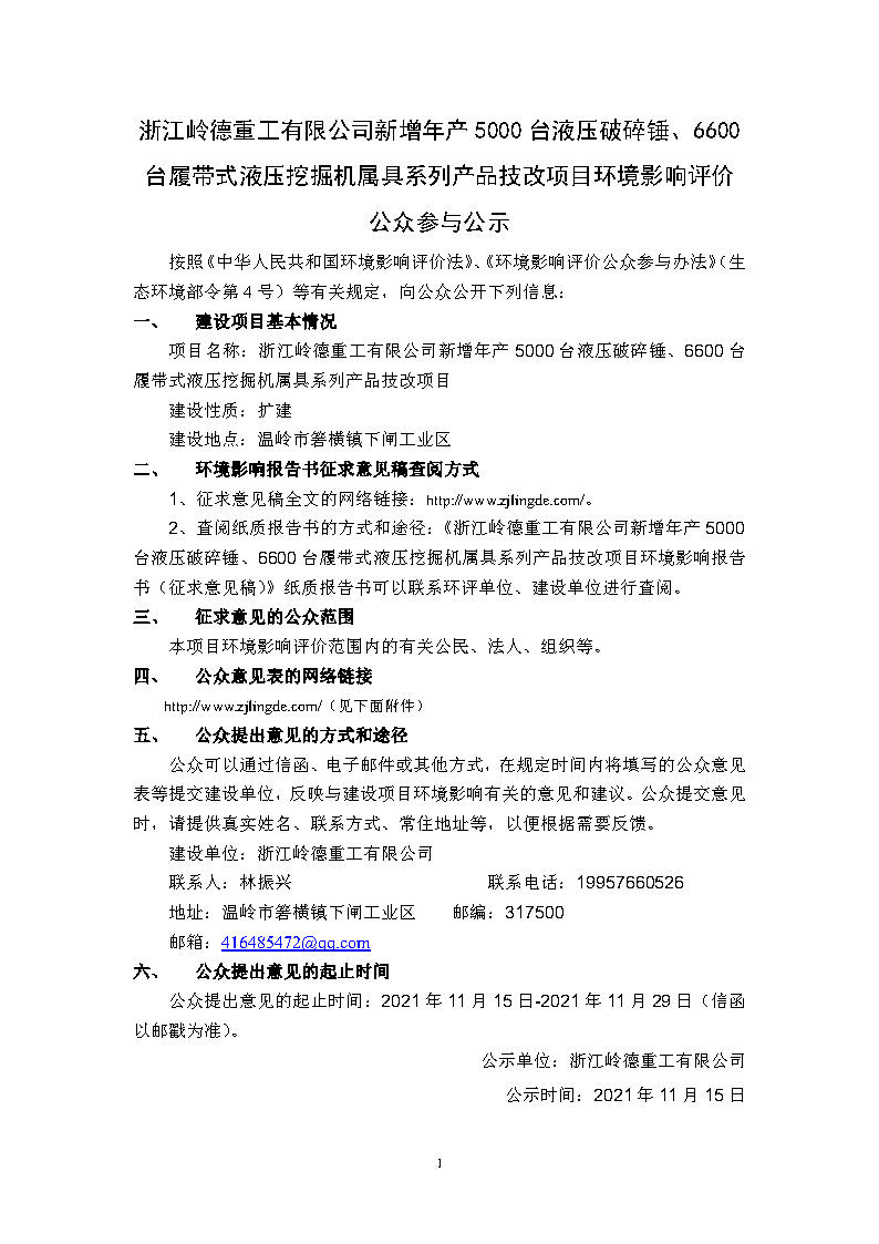 浙江嶺德重工有限公司新增年產(chǎn)5000臺液壓破碎錘、6600臺履帶式液壓挖掘機(jī)屬具系列產(chǎn)品技改項(xiàng)目環(huán)境影響評價公眾參與公示